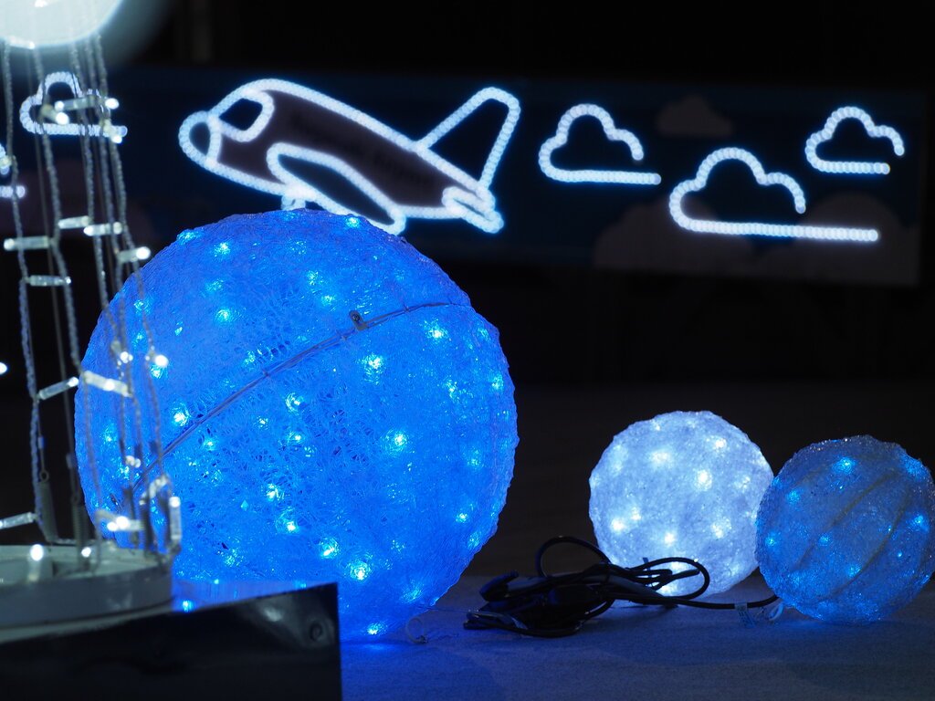イルミネーションと飛行機、滑走路灯の光も