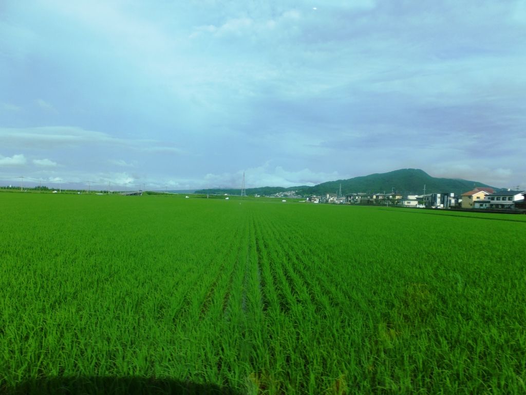 田圃の緑のじゅうたんが広がる風景。