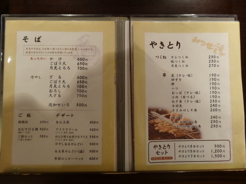 ニ八蕎麦、定食、焼き鳥から甘味まで幅広いラインナップ。