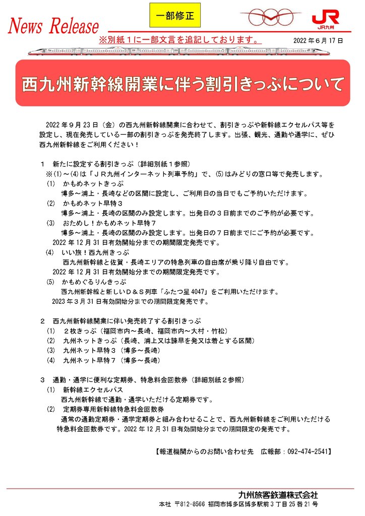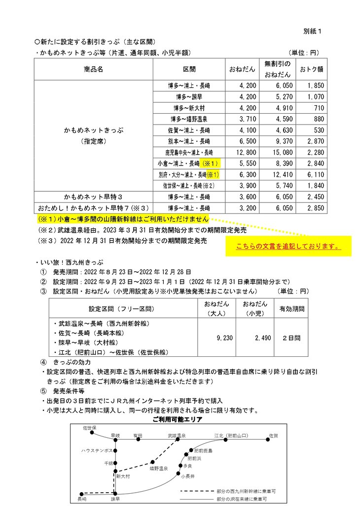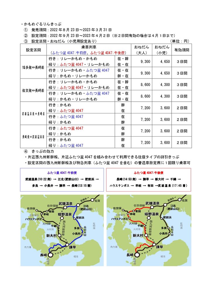 西九州新幹線の割引きっぷ概要(JR九州さんニュースリリースより)