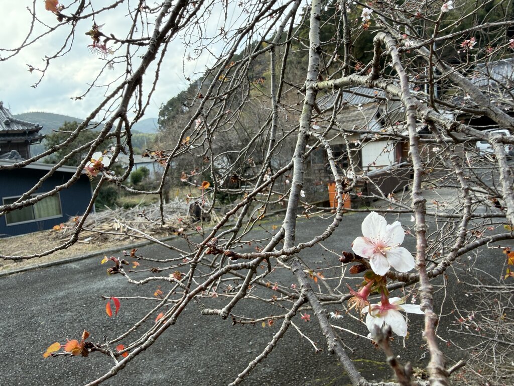 民家の入口にポツポツと咲いていた梅の花?